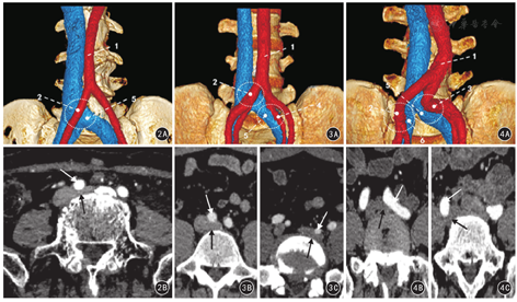 注:上排为容积再现(VR)图像;下排为对应上图压迫部位的CT增强扫描动脉期横断面图像;红色为动脉,蓝色为静脉,圆圈为压迫部位;1为腹主动脉;2为右髂总动脉;3为左髂总动脉;4为左髂内动脉;5为左髂总静脉;6为右髂总静脉