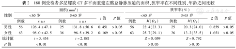 180例受检者多层螺旋CT多平面重建左髂总静脉压迫的面积、狭窄率在不同性别、年龄之间比较