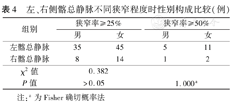 (3)分别以左、右侧髂总静脉狭窄率≥25%和≥50%为界限进行性别的比较。
