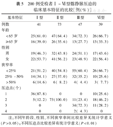 200例受检者Ⅰ~Ⅵ型髂静脉压迫的临床基本特征的比较[例(%)]