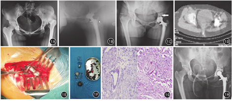 2018年4月25日在全身麻醉下行左侧全髋关节翻修术(LINK防脱位臼)。术中见:髋关节假体大量变性黑色电解组织,术后病理证实为炎性假瘤;髋臼端螺钉穿出臼杯,内衬碎裂、髋臼杯严重磨损;髋臼外上方可见螺钉固定植骨,臼底腔隙性缺损。术中常规取出髋臼假体及股骨金属头(股骨假体无松动未取出),发现髋臼后壁存在,前壁及底部大量骨缺损,无法形成假体压配,遂置入骨水泥防脱位臼。见图1E,图1F,图1G。患者术后第2天下地行走,左髋功能恢复良好,双下肢等长,无明显疼痛。术后X线提示:左侧全髋关节翻修术后,假体位置良好(图1H)。术后1个月门诊复查左髋关节功能良好,左髋Harris评分为89分,较术前(64分)明显提高。