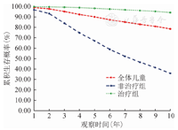 截至观察终点,我国≤14岁HIV感染儿童平均生存时间为179.75个月,高于泰国南部地区和埃塞俄比亚北部地区同年龄组儿童生存时间[4,5]。观察对象确诊阳性后1、2、5、10年的累积生存概率均高于福建省同年龄组儿童研究结果[6]。儿童的免疫系统相较成年人更易受到病毒的影响,一旦HIV感染,病程进展迅速,在得不到很好的关怀治疗服务情况下,很快会发生死亡[7]。同时部分HIV感染儿童发现较晚,在诊断后病程迅速进展,从而在确诊阳性1年内死亡[8]。从分组情况来看,接受抗病毒治疗组儿童10年的累积生存概率高于我国河南省同年龄组[9],1、2、5、10年累计生存概率均高于坦桑尼亚、印度和埃塞俄比亚的HIV感染儿童[10,11,12]。