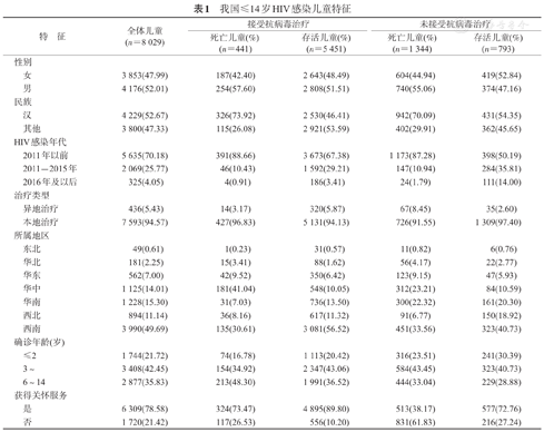 截至2017年底,全球共有3 690万人感染HIV,其中≤14岁感染儿童180万人,占全部HIV感染者的4.88%[2]。HIV感染儿童由于年龄小,生理功能尚未成熟且自我管理能力较低,疾病进展较快,需要及时进行治疗[3]。现阶段国内外针对HIV感染儿童全阶段生存情况及影响因素的研究较少,因此本研究将通过回顾性研究对我国≤14岁HIV感染儿童生存情况及影响因素进行探究。