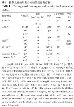 儿童利奈唑胺药代学数据多源于非MTB感染研究。其在MDR-TB患儿中的最佳剂量和疗程尚未明确,迫切需要更多相关的药代-药效学研究。目前利奈唑胺可参照表1给药,优先选用WHO方案。