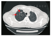 注:右上肺可见斑片状高密度影,边缘不清,内密度不均匀(箭头示)