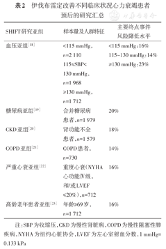 心衰患者常伴有糖尿病、慢性肾脏病(chronic kidney disease,CKD)、慢性阻塞性肺疾病(chronic obstructive pulmonary disease,COPD)等合并症,同时低血压也是心衰管理中不容忽视的问题。伊伐布雷定对血压、糖脂代谢、支气管平滑肌等均无影响,SHIFT研究进一步分析显示,伊伐布雷定能够降低不同血压水平[18]、糖尿病[19]、CKD[20]、COPD[21]等不同临床状况的心衰患者以及严重心衰[22]、高龄老年心衰患者[23]的主要终点事件(心血管死亡和心衰恶化入院)风险(表2),且安全性良好。