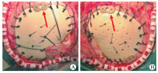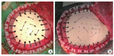 钛网等传统颅骨修补材料术后并发症的发生率为26.4%,其中最常见的是出血,我院无术后出血再手术病例[7,8]。但统计显示不同时期出现皮下积液的发生率为41.5%(27/65),原因可能有:①在大多数学者关于颅骨修补手术并发症的报道中,因皮下积液症状轻微,处理简单,并未纳入;②由于本研究仿生骨修补手术对象为儿童,运用新材料的手术过程十分精细,止血彻底;另外因术后治疗患儿配合度不佳,保留皮下引流管风险较高、护理困难,因此前期大多数手术均没有放置皮下外引流;③仿生材料骨瓣仍为异体材料,表面较光滑,孔洞数量较钛网少、直径小,皮瓣内生肉芽与硬膜表面的外生肉芽之间粘连困难,易形成空腔;④颅骨缺损多为脑外伤导致,患儿术前就有不同程度的脑积水、脑软化或脑肿胀,颅内压较高,术中未处理妥当;⑤手术可能导致小的硬膜破损,导致脑脊液外漏或硬膜悬吊不密,残留有空腔,加之包扎不严密,易产生漏出液及渗出液。除此外,我们发现多数额颞去骨瓣术后的患儿,皮下积液均自较低位颞窝方向。因此,无论是用注射器抽吸皮下积液还是穿刺外引流皮下积液,均应靠近颞底。我们还发现,修补术中颞肌行骨瓣外复位避免颞肌嵌顿,避免颞肌与骨窗缘摩擦,减少组织液渗出(图2A)。但如颞肌萎缩>3/4,就没有必要分离颞肌,可以行颞肌外修补(图2B)。但这需在术中修剪并打磨仿生骨瓣边缘,为颞肌根部预留空间,防止颞肌嵌顿。术后采用皮下外引流管并辅以加压包扎,可使皮瓣紧贴于仿生骨外表面,不留死腔,效果较好。