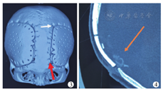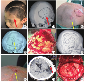 感染是颅骨修补术后最严重的并发症(图7)。我院1例12岁男性患儿,入院后因行为举止怪异,经心理卫生科会诊考虑颅脑外伤性精神障碍,术前及术后均运用奋乃静片控制精神症状。术后有1处结痂至出院未脱落,7个月后患儿因结痂下反复"流水"再次来我院就诊,追问病史,家属诉患儿有不停用手"挠头"的情况。再次入院后给予切口分泌物培养,并行头颅CT检查,发现硬膜外可疑高密度影,立刻给予手术探查。术中见骨瓣下大量黄色脓苔,除抛弃植入骨瓣并清理感染软组织外,更对周围炎性骨组织进行扩大清除。感染原因除患儿有明确精神症状外,我们还考虑患儿为车祸外伤后颅骨缺损,伤情较重,头皮及皮下成分血供差。加之骨瓣固定线结恰巧位于切口下方,反复刺激瘢痕切口,引发患儿瘢痕瘙痒,反复搔抓,最终导致感染。