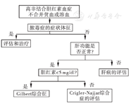 GS是UGT1A1基因变异导致体内UDPGT活性偏低的一种良性先天性高非结合胆红素血症。GS中UGT1A1基因异常包括两种类型:(1)启动子区域TATA框插入型突变,为常染色体隐性遗传,在TATA框中有TA插入,使正常A(TA)6TAA突变为A (TA)7TAA,此突变在西方人中常见[13];(2)外显子区域单碱基突变,为常染色体显性遗传,东方人中多为此类型,其中,第1外显子(Gly71Arg)较为多见,另外,第1外显子(Pro229Gln)、第4外显子(Arg367Gly)、第5外显子(Tyr486Asp)的突变等也有报道[14]。正常人群的UGT1A1基因变异频率较高(西方人群中约51%拥有至少一个Gilbert类型的等位基因),因此不同人群中GS患病率约为4%~16%。与CNS不同,GS患者的酶活性仅轻度受损,血清胆红素通常波动于1~6 mg/dl,其黄疸发作可由导致胆红素生成增加的状况触发,如禁食、溶血、感染、应激、体力活动、月经期等,较少诊断于青春期前,大多无需特殊治疗。新生儿期合并ABO溶血或G6PD酶缺乏症时也可被发现[15]。亦有观点认为CNS-Ⅰ型、CNS-Ⅱ型、GS均可归为UGT1A1异常谱系疾病[16,17]。临床上发现高非结合胆红素血症的患者,如果不存在贫血及溶血问题,可按图2流程进行鉴别诊断。