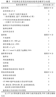 获得结核分枝杆菌的传统微生物学或核酸扩增试验阳性证据可确诊中枢神经系统结核病。在缺乏颅内病原学诊断依据的情况下,临床上出现发热、呕吐、易激惹、脑膜刺激征、抽搐、局灶性神经损伤、意识状态改变中的一项或多项表现,符合诊断评分标准的相应分值(表2),可诊断为中枢神经系统结核病。评分≥12分或≥10分(无法进行影像学检查时)为高度疑似病例,评分在6~11分或6~9分(无法进行影像学检查时)为疑似病例[13]。由于临床表现和脑脊液细胞学、生物化学等检查难以区分中枢神经系统结核病和下述疾病,所以临床评分为高度疑似病例和疑似病例时,需结合年龄、机体免疫状态,以及地理位置、季节进行鉴别诊断,尽可能排除以下疾病:治疗不彻底的化脓性脑膜炎、隐球菌性脑膜炎、病毒性脑膜脑炎、梅毒性脑膜炎、脑型疟疾、布鲁菌脑膜炎、寄生虫(血管圆线虫、棘颚口线虫、弓蛔虫、囊尾蚴)引起的或嗜酸细胞性脑膜炎、脑弓形体病和细菌性脑脓肿(脑成像表现为占位性损伤)、恶性肿瘤(如脑膜瘤、胶质瘤、淋巴瘤、肺癌、乳腺癌等肿瘤引起的癌性脑膜炎)、自身免疫性脑炎等。二代测序在诊断病毒、细菌、真菌和寄生虫感染方面具有一定的优势,常规方法未检测到病原体且怀疑为中枢神经系统感染者,行二代测序检测可进一步提高病原学检出率。中枢神经系统结核病的严重程度与最终病死率和致残率密切相关[14],诊断时应以改良的MRC结核性脑膜炎分期标准(表3)进行分期以评估预后,MRCⅢ期患者的病情严重,预后最差。