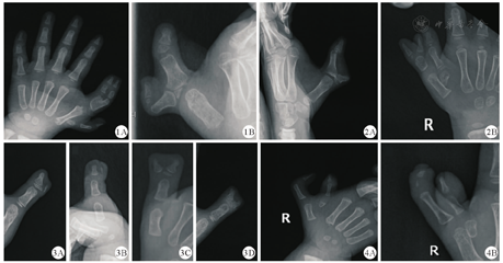 经过临床医师的仔细阅片,本组资料中仍有238指(11.0%)特殊病例无法按现有Wassel分型方法进行分型,荷兰Dijkman等[8]对520例多拇畸形进行分型,全部病例均可使用Rotterdam分型系统进行归类,40%病例无法归入Wassel分型系统。但苏森等[2]统计的结果显示仅有8.6%的多指无法归入Wassel分型系统;本组资料显示11.0%的病例无法归入Wassel分型系统(图1,图2,图3,图4)。对于特殊难以分型病例,高伟阳等[12]以拇指末节指骨形态和轴线偏移为依据进行新的分类并制定对应的治疗方案,术后效果满意。南国新等[13]提出非典型Wassel Ⅵ型并制定相应的治疗方案,治疗效果满意,减少了并发症。随着病例数量的增加,会出现较多特殊、难以归类的病例将重新分型或归类,为指导临床治疗奠定基础。减少手术并发症。