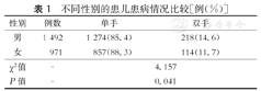 了解男女患儿在畸形发生部位的差异,发现男性患儿中左手463例,右手811例,双手218例,女性患儿中左手327例,右手530例,双手114例,男性患儿单手1 274例,双手218例,女性患儿单手857例,双手114例。由统计分析可知,多指畸形的左右手分布在性别间差异有统计学意义(χ2=4.157,P=0.041),结合构成比,男性患儿单手发病率低于女性患儿(表1)。