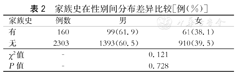 4.患儿家族史 共计2 463例多拇畸形,有家族史160例(6.5%),其中父(母)亲有多指畸形40例(25%)。通过对性别与家族史的差异性比较发现,家族史在性别间的差异无统计学意义(P>0.05,表2)。
