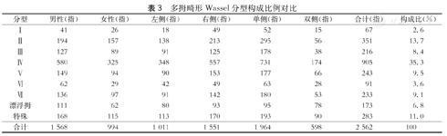 | 分型 | 男性(指) | 女性(指) | 左侧(指) | 右侧(指) | 单侧(指) | 双侧(指) | 合计(指) | 构成比(%) |