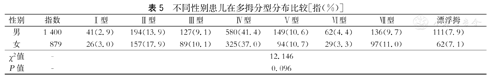 了解男女患儿在多拇分型比较的差异,男性患儿共计1230例(1400指),Ⅰ型41指,Ⅱ型194指,Ⅲ型127指,Ⅳ型580指,Ⅴ型149指,Ⅵ型62指,Ⅶ型136指,漂浮拇111指;女性患儿共计795例(879指),Ⅰ型26指,Ⅱ型157指,Ⅲ型89指,Ⅳ型325指,Ⅴ型94指,Ⅵ型29指,Ⅶ型97指,漂浮拇62指。由统计分析可知,不同分型在性别间分布差异无统计学意义(χ2=12.146,P=0.096)。(表5)