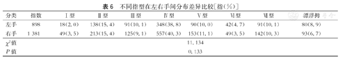 了解左右手患儿多拇分型比较的差异,左手共计644例(898指),Ⅰ型18指,Ⅱ型138指,Ⅲ型91指,Ⅳ型348指,Ⅴ型90指,Ⅵ型42指,Ⅶ型91指,漂浮拇80指;右手共计1 127例(1381指),Ⅰ型49指,Ⅱ型213指,Ⅲ型125指,Ⅳ型557指,Ⅴ型153指,Ⅵ型49指,Ⅶ型142指,漂浮拇93指。由统计分析可知,不同分型在左右手间分布差异无统计学意义(χ2=11.134,P=0.133),见表6。
