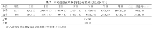 单手多拇共计1 771例(1 771指),其中Ⅰ型52指,Ⅱ型295指,Ⅲ型178指,Ⅳ型731指,Ⅴ型177指,Ⅵ型63指,Ⅶ型180指,漂浮拇95指;双侧多拇共计254例(508指),其中Ⅰ型15指,Ⅱ型56指,Ⅲ型38指,Ⅳ型174指,Ⅴ型66指,Ⅵ型28指,Ⅶ型53指,漂浮拇78指。由统计分析可知,不同指型在单双手间分布差异有统计学意义(χ2=74.285,P<0.01),卡方分割结果显示漂浮拇(指)在单双手分布差异具有统计学意义(P<0.01),结合构成比资料,漂浮拇(指)单手发病低于双手(表7)。