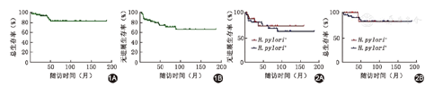 不同治疗方式比较,患者的OS差异无统计学意义,是否选择含有化疗的方案,患者的5年的PFS率(69%比86%)和OS率(82%比86%)差异无统计学意义(P=0.070、0.600)。分析化疗组患者共51例,比较H.pylori阳性和阴性者,5年的PFS率(68%比69%)和OS率(80%比81%)差异无统计学意义(P=0.430、0.610)。