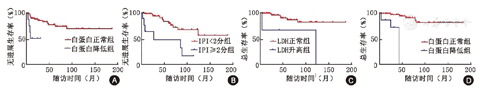 因分期为IPI组成部分,故将IPI评分、是否有淋巴结受累、白蛋白水平及初始治疗疗效纳入PFS的Cox分析。结果显示,白蛋白水平(P=0.011,HR=5.201)和IPI评分(P=0.017,HR=3.901)是PFS的独立预后指标(图3A、图3B)。白蛋白水平正常患者和白蛋白降低患者,两组的中位PFS分别为42.5个月和11个月,两组5年PFS率分别为77%和50%。IPI评分<2分和IPI≥2分患者,两组的中位PFS分别为36和9个月,两组的5年PFS率分别为80%和48%。将LDH水平、白蛋白水平及初始治疗疗效纳入OS的Cox分析,结果显示LDH水平(P=0.016,HR=9.936)和白蛋白水平(P=0.025,HR=9.591)是OS的独立预后指标(图3C、图3D)。LDH正常和升高患者,两组的中位OS分别为45和42个月,两组的5年OS率分别为87%和67%。白蛋白水平正常患者和白蛋白降低患者,两组的中位OS分别为50.5和28个月,两组的5年OS率分别为92%和73%。