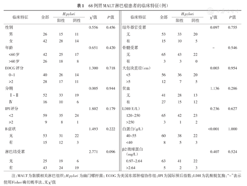 68例胃MALT淋巴瘤患者的临床特征(例)