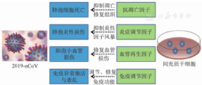 2019-nCoV感染导致肺上皮细胞和内皮细胞凋亡,且诱导免疫细胞在肺部聚集和过度活化。MSC向肺损伤部位迁移,分化为正常的肺泡上皮细胞修复屏障功能,调节上皮细胞功能以促进肺泡内液体的清除,发挥免疫调节功能以抑制炎性因子风暴,最终促进损伤肺组织的修复,见图1[23,24,25,26]。
