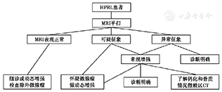 3.影像学检查(图1):经上述检查,证实为轻度HPRL而没找到明确病因或血催乳素>4.55 nmol/L均应行鞍区影像学检查(MRI或CT),以排除或确定是否存在压迫垂体柄或分泌催乳素的颅内肿瘤及空蝶鞍综合征等。鞍区病变的影像学检查主要为CT和MRI。MRI检查软组织分辨率高,可以多方位成像,在垂体微小肿瘤的检出、鞍区病变的定性、定位诊断等各个方面都明显优于CT,并且无放射线损伤,可以多次重复进行,是鞍区病变首选的影像学检查方式。MRI检查常规应包括薄层、小扫描野(FOV)的矢状位和冠状位T1WI序列,且需至少1个平面的T2WI(矢状位或冠状位)。尽管有些病变MRI平扫即可提出较确定的诊断,仍建议同时行鞍区增强MRI检查,病变检出率更高,必要时还应行鞍区动态增强的MRI检查[11]。