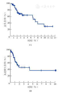 79例(79.0%)患者CC评分达0~1分,mOS时间为95.2个月(95%CI 44.4~146.0个月),1、2、3、4、5年生存率分别为95.4%、84.1%、78.7%、73.8%和73.8%;mPFS时间为23.3个月(95%CI 0~50.7个月)(图1B)。4例(4.0%)患者OS时间超过10年,术后无复发,生存期分别为147.7、128.5、121.5、120.8个月。
