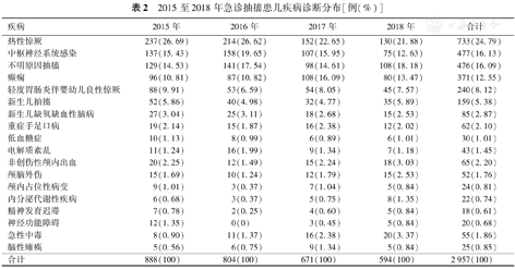 2015至2018年急诊抽搐患儿疾病诊断分布[例(%)]
