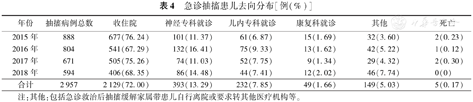 经急诊科镇静止惊抢救治疗后,72.00%的患儿收住院继续治疗,13.29%转到神经专科门诊就诊,7.85%转到儿内专科门诊就诊,1.66%转康复科门诊就诊,0.17%患儿死亡。其中,5例患儿死亡分别是:2015年1例颅脑外伤(车祸伤颅内出血)、1例重症手足口病;2016年1例非创伤性颅内出血(晚发性维生素K1缺乏症);2017年2例颅脑外伤(高坠伤颅内出血)。4年间,收住院病例数随着抽搐病例数递减而逐年递减,见表4。