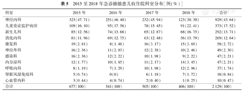 2015至2018年急诊抽搐患儿收住院科室分布[例(%)]