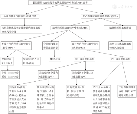 心源性缺血性脑卒中/TIA患者,围手术期血栓栓塞风险分级及处理同非瓣膜性房颤和瓣膜性房颤患者。距离缺血性卒中/TIA发病时间越近,复发风险越高;发病3个月以内者列为高危,3个月以上者列为中危,未发生者列为低危[4]。这些患者同时要兼顾房颤本身的CHA2DS2-VASc评分,以风险分级较高的结果作为最终血栓栓塞风险分级结果。