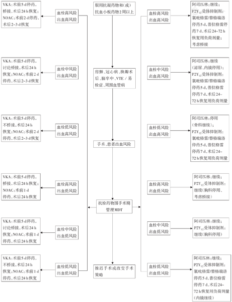 在评估患者停用抗血栓药物后的血栓栓塞风险、手术出血风险、熟悉各类抗栓药物药理学特点以及桥接方案后,权衡利弊决策是否在术前停用抗血栓药物。若确认围手术期需停用药物,则根据患者使用药物的半衰期和患者自身情况决定停药时间,根据药物的起效时间决定术后恢复服药的时间;同时,根据药物的特性以及血栓栓塞的风险分级,确认围手术期是否进行桥接并制定桥接方案。由于整个决策过程比较复杂,因而推荐形成多学科协作团队,共同会诊后,最终形成针对该患者的围手术期抗血栓药物管理方案(图2)。