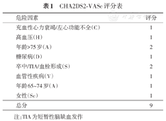 房颤是最常见的心律失常之一。我国2004年所发表的数据显示,30~85岁人群中房颤发病率为0.77%;脑卒中等血栓栓塞性并发症是房颤致死致残的主要原因[13]。合理应用抗凝药物、预防卒中的新发和复发是房颤患者综合管理策略中的重要内容。根据基线特征对患者进行危险分层是制定抗凝治疗策略的基础,目前CHA2DS2-VASc评分[14]是临床上应用最广泛的评估工具(表1)。