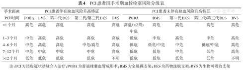 2018年发布的PCI术后患者行外科手术围手术期抗血栓药物多学科管理意见中,对PCI术后患者围手术期血栓栓塞风险进行分级[25],具体见表4。对于PCI术后>12个月的患者,围手术期血栓栓塞风险为低危,可以进行择期手术。而对于PCI术后12个月以内的患者要根据多种因素决定择期手术时间。概括而言,单纯冠状动脉普通球囊扩张后至少2周再行择期手术,植入金属裸支架(BMS)后至少1个月再行择期手术,植入药物洗脱支架(DES)后至少3个月再行择期手术,对于新一代的DES可以根据情况适当缩短时间,植入生物可吸收支架(BVS)后至少12个月再行择期手术。该多学科管理意见未包括药物涂层球囊(DCB)术后的患者,但目前DCB在国内使用也逐渐增加。由于DCB推荐的双联抗血小板时间为1~3个月[26],所以DCB术后至少1个月再行择期手术。在针对具体患者时,可参照表4进行血栓风险分级,其中,缺血风险升高的临床证据包括此次PCI时临床表现为ACS、既往多次心肌梗死病史、既往规范抗血小板治疗过程中发生支架内血栓、左室射血分数<35%、慢性肾脏疾病和糖尿病;缺血风险升高的造影证据包括长支架或多个支架(至少植入3枚支架或治疗3处以上病变或支架总长度>60 mm)、重叠支架、支架直径小(<2.5 mm)、分叉处病变(植入2枚支架)、广泛的冠状动脉病变性冠心病、血运重建不完全或慢性完全闭塞病变的治疗。若患者无法提供支架等冠心病相关信息,建议术前心内科会诊,进一步对手术耐受情况及血栓风险进行评估。