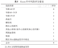 目前尚缺乏缺血性脑卒中/TIA患者围手术期卒中风险分级评估的方法。非心源性缺血性脑卒中/TIA发病在6个月内、合并颅内外责任血管狭窄>50%者,定义为症状性狭窄,为卒中复发高危人群;距发病时间越短、狭窄程度越重,卒中复发风险越高。症状性颅内动脉狭窄>70%的患者,即使经积极内科药物治疗,发病1年内脑卒中和死亡的复合终点事件发生率仍高达12.2%[35],为卒中复发的高危人群。颅内外责任血管狭窄>50%,缺血性脑卒中/TIA发病6个月以上或者未曾发生者,定义为无症状性狭窄,为卒中复发高危或中危人群。对于不合并颅内外责任血管狭窄患者,缺血性脑卒中/TIA发病时间3个月之内为高危,3个月以上患者可采用Essen卒中风险评分量表对围手术期卒中风险进行评估(表5),评分越高复发风险越高,≥3分为围手术期卒中的中危人群,<3分为低危人群。若合并非责任血管狭窄,则需要多学科专家会诊来评估围手术期脑卒中/TIA的复发风险[36]。