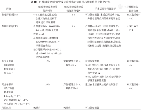 区域阻滞穿刺/置管或拔除操作时抗血栓药物的停药及恢复时机