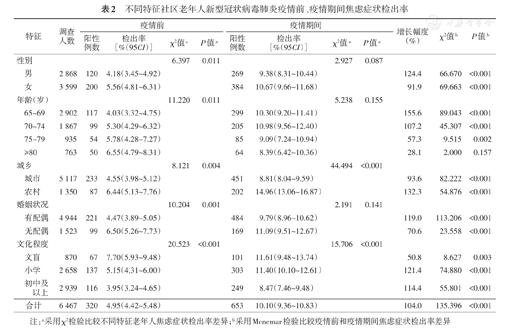不同特征社区老年人新型冠状病毒肺炎疫情前、疫情期间焦虑症状检出率