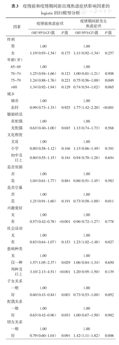 本研究的优势是通过队列研究的方法比较同一老年人群在疫情发生前后焦虑症状发生的影响因素,调查对象来自22个省(市、自治区)的108个社区,样本量大,覆盖面广。本研究也存在一些局限,一是没有采取随机抽样方法选择调查对象,可能会存在调查对象选择上的偏倚;二是疫情期间心理状况的调查是在疫情防控进入平稳阶段后开展的,所以可能会低估疫情最严重期间老年人群的实际焦虑症状发生水平。