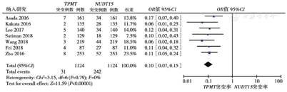 纳入10篇文献,共3095例患者。Meta分析显示,亚洲IBD人群中NUDT15基因突变率明显高于TPMT基因突变率(21.5%比2.8%,OR = 0.10,95%CI:0.07 ~ 0.15,P<0.001),差异具有统计学意义;NUDT15基因突变与AZA相关的白细胞减少具有显著相关性(OR = 0.40,95%CI:0.34 ~ 0.47,P<0.001);NUDT15突变的IBD患者更易在应用AZA的早期出现白细胞减少(OR = 2.69,95%CI:1.67 ~ 4.33,P<0.001);同时NUDT15基因纯合突变型(TT型)更易出现Ⅲ~Ⅳ级的骨髓抑制(OR = 0.09,95%CI:0.04 ~ 0.18,P<0.001)。
