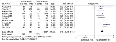10篇文献[4,5,6,8,9,10,11,12,13,14]纳入3095例患者分析了在IBD患者中AZA相关的外周血白细胞变化与NUDT15基因突变率的差异,各研究间显示存在明显异质性(P = 0.02,I2 = 55%),采用随机效应模型分析结果显示,白细胞减少组的NUDT15突变率高于白细胞正常组(54.6%比15.4%,OR = 0.40,95%CI:0.34 ~ 0.47,P<0.001),差异有统计学意义,提示NUDT15基因突变与AZA相关的白细胞减少具有显著相关性,见图3。