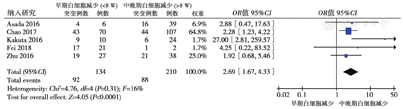 5篇文献[4,8,9,10,11]分析NUDT15等位基因突变与白细胞减少发生的时间关系,共纳入344例患者。各研究显示异质性低(P = 0.31,I2 = 16%),采用固定效应模型分析结果显示,早期白细胞减少症患者NUDT15基因突变率高于晚期白细胞减少症(68.7%比41.9%,OR = 2.69,95%CI:1.67 ~ 4.33,P<0.001),表明NUDT15突变的患者更易在服用AZA的8周内发生白细胞减少,见图4。