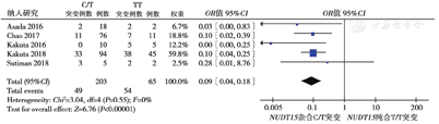 采用RevMan 5.3统计软件进行系统评价分析。首先进行异质性分析,I2>50%提示存在明显异质性,若P<0.05,各研究结果存在实质异质性,采用随机效应模型分析;若P≥ 0.05,各研究结果无明显异质性,则采用固定效应模型分析;其余同质性较好(I2<50%)均采用固定效应模型分析。NUDT15突变与AZA引起IBD患者白细胞减少的关系,计算得到相对危险度(odd ratio,OR)和95%置信区间(CI)表示效应量,以P<0.05为差异具有统计学差异。