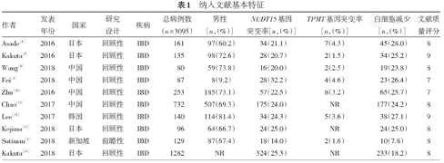 纳入标准:(1)研究类型:随机对照研究或队列研究;(2)研究目的:国内外公开发表的NUDT15基因突变与AZA治疗IBD引起的白细胞减少不良反应关系的研究;(3)研究对象:确诊的IBD患者(包括溃疡性结肠炎、CD、未定型IBD),性别不限,年龄>14岁;(4)干预措施:患者均接受AZA治疗,并且行基因检测(NUDT15和TPMT);(5)结局:外周血中白细胞减少(白细胞<4.0 × 109/L)。