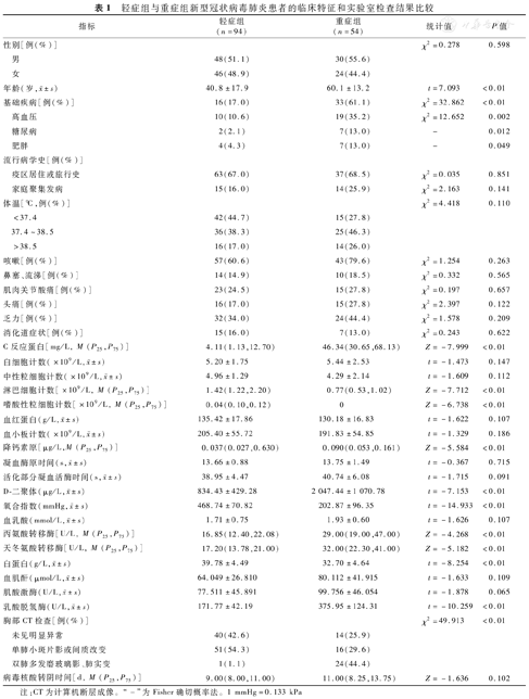 | 指标 | 轻症组(n=94) | 重症组(n=54) | 统计值 | P值 | |
