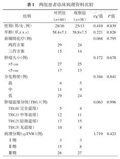 两组患者在性别、年龄、新辅助化疗方案、肿瘤大小、分化程度、肿瘤退缩分级(TRG)、病理分期等差异均无统计学意义(均P>0.05),存在可比性(表1)。