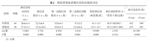 观察组共检出淋巴结1 260枚,对照组共检出淋巴结981枚。观察组淋巴结检出时间短于对照组,淋巴结检出数目、第一站淋巴结数目、第二站淋巴结数目、阳性淋巴结数目、直径<5 mm淋巴结数目均多于对照组,差异均有统计学意义(均P<0.05)。两组在淋巴结转移率方面差异无统计学意义(P>0.05)(表2)。