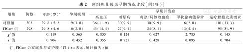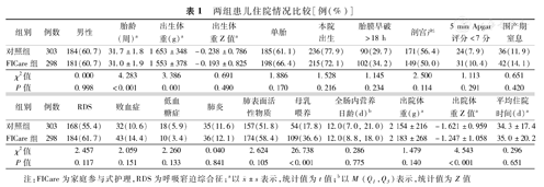 11家NICU随机分为FICare组6家、对照组5家。FICare组符合纳入标准的早产儿共1 260例,排除962例(预计1周内出院332例、机械通气249例、父母不能每日来医院护理211例、需外科手术治疗62例、父母存在严重社会问题或语言交流障碍49例、父母不同意签署知情同意书24例、父母不明原因放弃22例、仅给予安慰性治疗10例、体重<400 g 3例),最终共纳入298例;对照组符合纳入标准早产儿共1 231例,排除928例(预计1周内出院388例、机械通气223例、父母不能每日来医院护理162例、父母不明原因放弃64例、父母存在严重社会问题或语言交流障碍44例、需外科手术治疗34例、仅给予安慰性治疗7例、父母不同意签署知情同意书4例、体重<400 g 2例),最终纳入303例。FIcare组婴儿胎龄及出生体重低于对照组,母乳喂养率高于对照组,差异有统计学意义(P<0.05)。见表1。两组患儿母亲孕期情况比较差异无统计学意义(P>0.05),见表2。