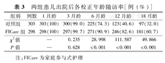 从校正年龄1月龄至18月龄各时间点的随访病人数及随访率逐渐下降,对照组的下降趋势更明显,FICare组各时间点的随访率均高于对照组,两组校正年龄6月龄至18月龄的随访率比较差异有统计学意义(P<0.001)。见表3。