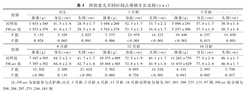 比较两组患儿各随访时间点实际获得的体格发育数据,在校正年龄1、3、6、18月龄时FICare组体重高于对照组(P<0.05),在校正年龄1、3月龄FICare组身长大于对照组(P<0.05),在校正年龄1、3、6、12、18月龄FICare组头围大于对照组(P<0.05)。见表4。