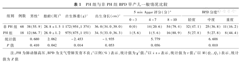 在住院系统中收集两组早产儿病例资料,包括:(1)早产儿一般情况:性别、胎龄、出生体重、出生身长、Apgar评分、BPD分度。(2)母亲妊娠期情况:母亲年龄、分娩方式、是否合并妊娠期糖尿病、妊娠期高血压、胎盘早剥、胎膜早破>18 h。(3)多普勒心脏彩超检查结果:房间隔缺损、动脉导管未闭、卵圆孔未闭、室间隔缺损。(4)疾病情况:早发性PH、新生儿呼吸窘迫综合征(respiratory distress syndrome,RDS)、坏死性小肠结肠炎(necrotizing enterocolitis,NEC)、贫血、电解质紊乱、酸碱失衡、颅内出血、败血症。(5)治疗情况:肺表面活性物质、机械通气时间、用氧时间、住院天数。